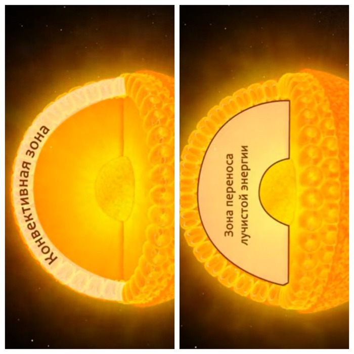 Путешествие фотонов сквозь недра Солнца к его поверхности продолжается долгие сотни тысяч лет, они проходят зону лучистого переноса энергии, где температура плазмы постепенно падает до 2 млн градусов, затем попадают в конвективную зону, где происходит циркуляция горячего газа и в результате перемешивания плазмы энергия переносится к поверхности светила – подобно тому, как это происходит в кастрюле с кипящей водой.