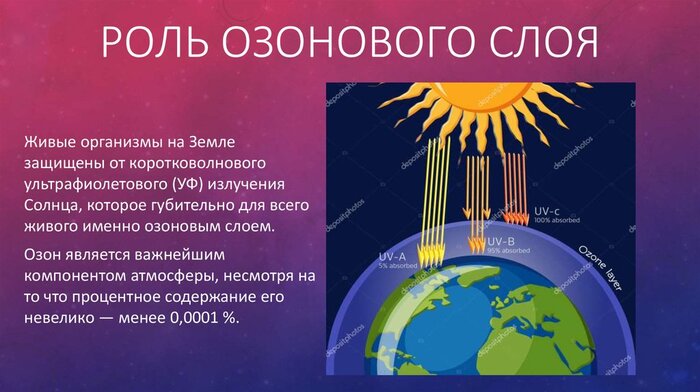 Кроме необходимой нам для жизни энергии тепла и света, Солнце испускает и невидимые человеческому глазу ультрафиолетовые, а также рентгеновские лучи, избыток которых уничтожил бы всё живое на Земле – но от смертоносной радиации нас защищает озоновый слой, находящийся в стратосфере нашей планеты на высоте от 12 до 50 км. Довольно высокая концентрация озона, молекулы которого состоят из трех атомов кислорода, поглощает бо́льшую часть опасных ультрафиолетовых лучей.