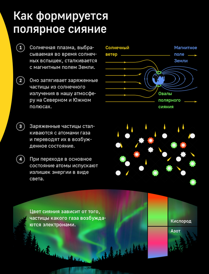 Из короны постоянно истекает поток ионизированных частиц гелиево-водородной плазмы, называемый солнечным ветром. Когда эти частицы сталкиваются с магнитным полем Земли (над земными магнитными полюсами), мы можем наблюдать полярные сияния: