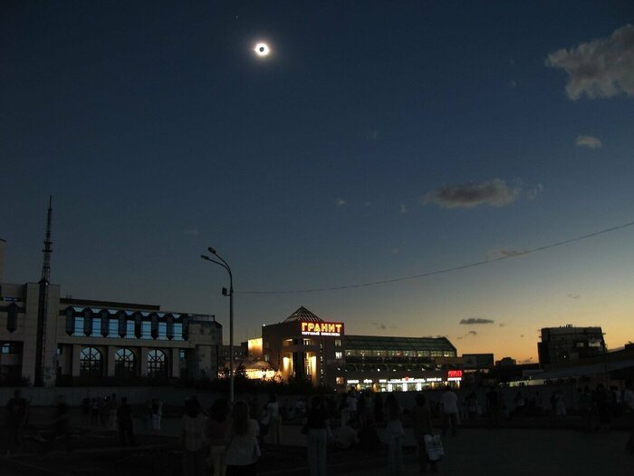 Это интересное природное явление длится всего несколько минут, но запоминается на всю жизнь: вдруг, посреди бела дня, наступают сумерки, лунный диск на небе быстро движется, постепенно закрывая солнце, от которого остается одна корона, обрамляющая черный круг. Становится почти темно, даже птицы затихают… а люди с интересом смотрят на Солнце через специальные очки или закопченные стекла. На потемневшем небе можно разглядеть даже некоторые звезды – конечно, если стоит ясная погода. Наконец, Луна начинает отходить в сторону, и через пару минут день возвращается. Вот как выглядело затмение в Новосибирске 1 августа 2008 года, которое довелось наблюдать и мне: