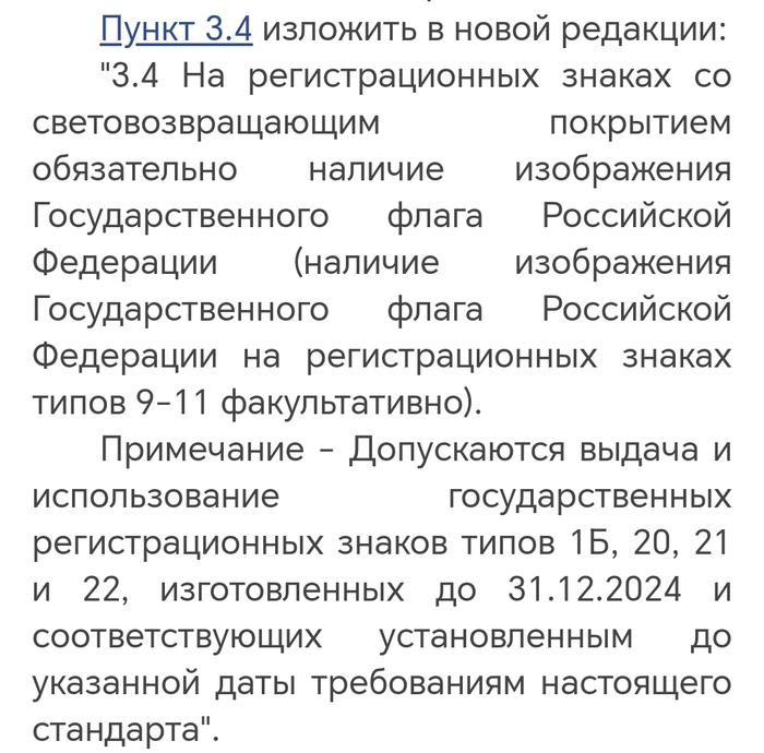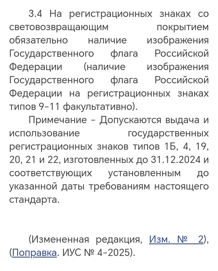 Позвонил в МРЭО, там сказали, что номера без флага нельзя использовать с 01.01.2025 (это касается только тех транспортных средств, которые зарегистрированы после этой даты, на тех, кто регистрировал авто до вступления изменений в силу, нововведение не распространяется и им не придется менять свои номера). Сказал им по телефону, что мне сегодня выдали такие номера на мотоцикл, они ответили, что на мотоцикл это не распространяется. Но как не распространяется, если ГОСТ един. Начал разбираться. Имеем ГОСТ Р 50577-2018 "Знаки государственные регистрационные транспортных средств. Типы и основные размеры. Технические требования". Изначально в нем небыло обязательного требования по наличию флага РФ
