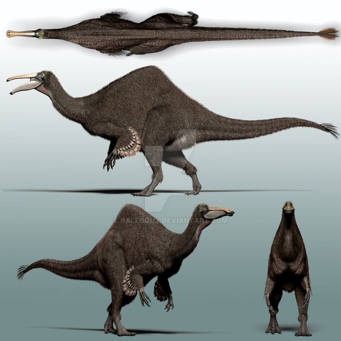 Название «дейнохейрус» переводится как «ужасная рука», и передние конечности у него действительно были большими и когтистыми. Ими ящер ловил рыбу. На спине присутствовал огромный то ли гребень, то ли горб — наука пока ещё в растерянности.