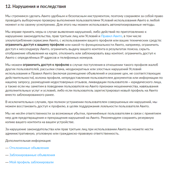 После чего данный ответ перебрасывает меня на правило Авито, а именно пункт 12