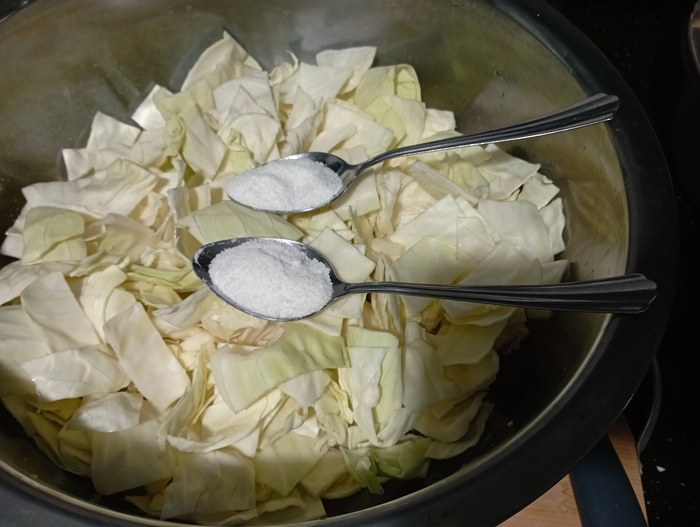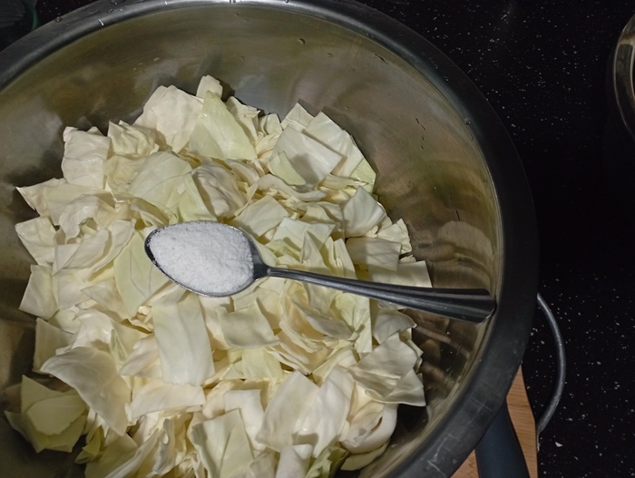 Добавляем соль, одну или две ст.ложки, что бы капуста дала сок.