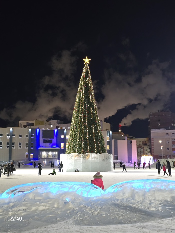 Сидя на кухне с горячим кофе я смотрел в окно и думал, замем я тут для чего, на улицу идти совершенно не хотелось, легкий ветерок так и норовил сбить с ног или протащить по заледеневшему тротуару, но, очень хотелось увидеть ёлочку. Я был немало удивлен, что с ёлки не идет никакого дыма. Все таки центр цветной металлургии с заводами, трубами, дымом и серым снегом. Я представлял толпы суровых вахтовиков на улицах. Но был слышен детский смех, люди катались на катке, кто-то в отдалении даже на лыжах, и только изредка, в магазине, можно было увидеть человека в спецовке.