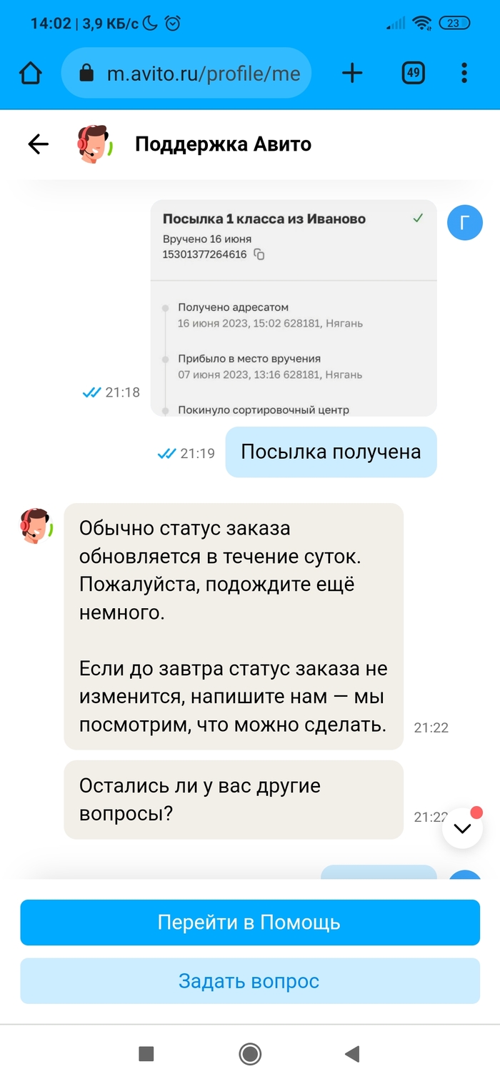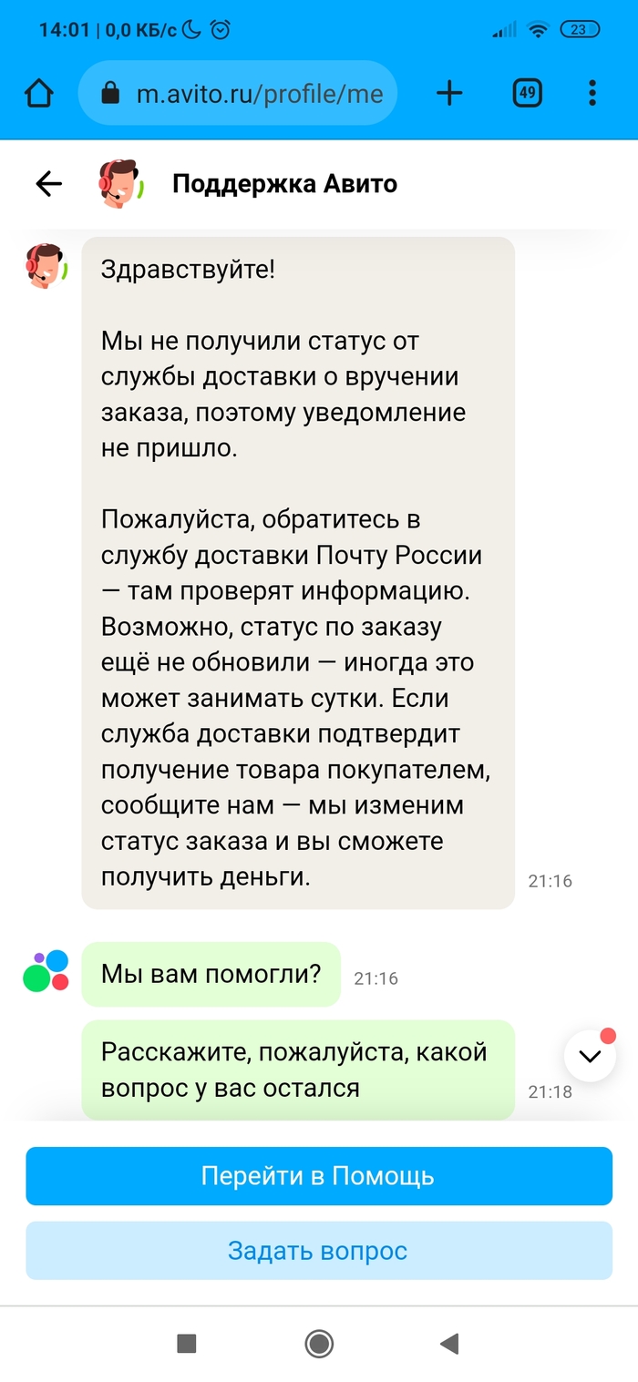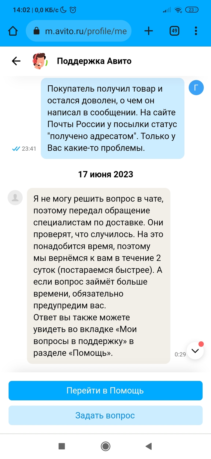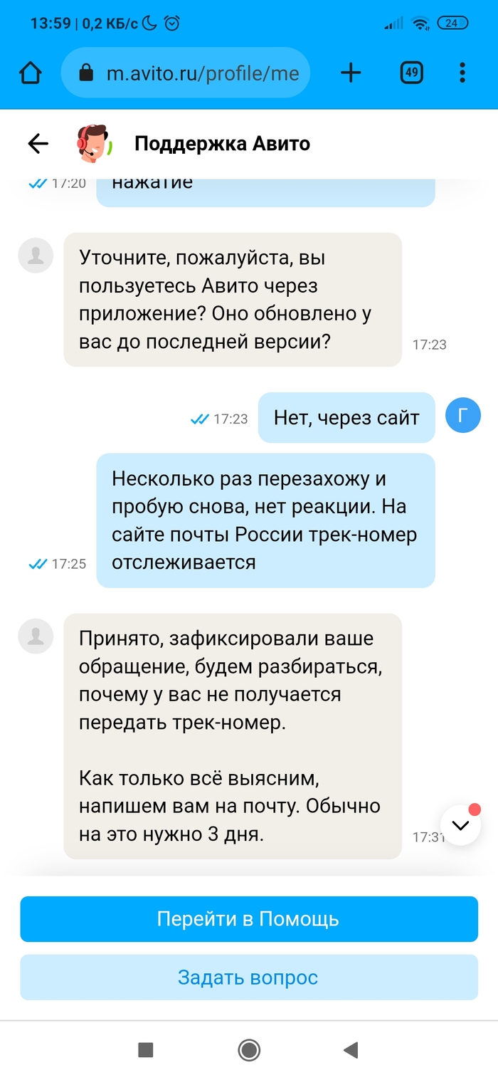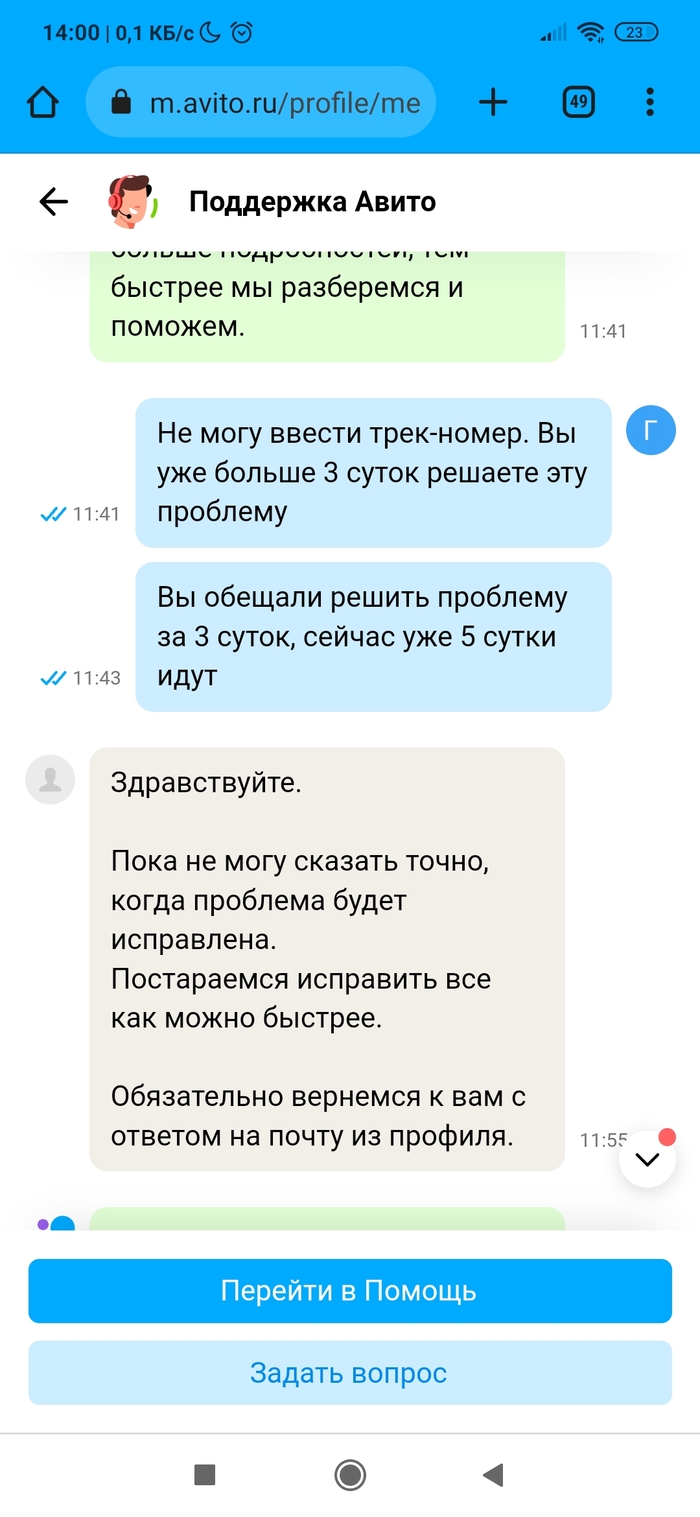 • Разместил вещь на Авито. Нашёлся покупатель. Отправил Авито доставкой (она сейчас какая-то новая, нужно самому оценить стоимость доставки и указать её покупателю, в общем, всё сделать самому). Ну да бог с ней. Посылку отправили, но трек-номер не вводился на сервисе Авито. А без трек-номера сделка через несколько дней признается несостоявшейся по вине продавца. Причём на сайте Почты России было всё чётко. Долбежка в техподдержку не помогла, разве только что сроки указания трек-номера сдвигались. По итогу трек-номер смогли ввести только после доставки посылки в пункт выдачи. А это около недели прошло. Уже звоночек. А дальше началось. Посылку покупатель (очень порядочный человек оказался) забрал, по трек-номеру на сайте Почты России это тоже видно. Посылкой покупатель доволен. А вот Авито сново затупило. Пишет, что заказ в пункте выдачи ждёт. Покупатель уже сам написал Авито, что всё забрал. Но нет, логисты Авито не верят ни данным Почты России по трек-номеру ни покупателю. Абсурд ещё и в том, что просят ждать. Я жду с 16 июня, а сколько ждать - они уходят от ответа. Авито доставка уже не та, или работнички такие попались...