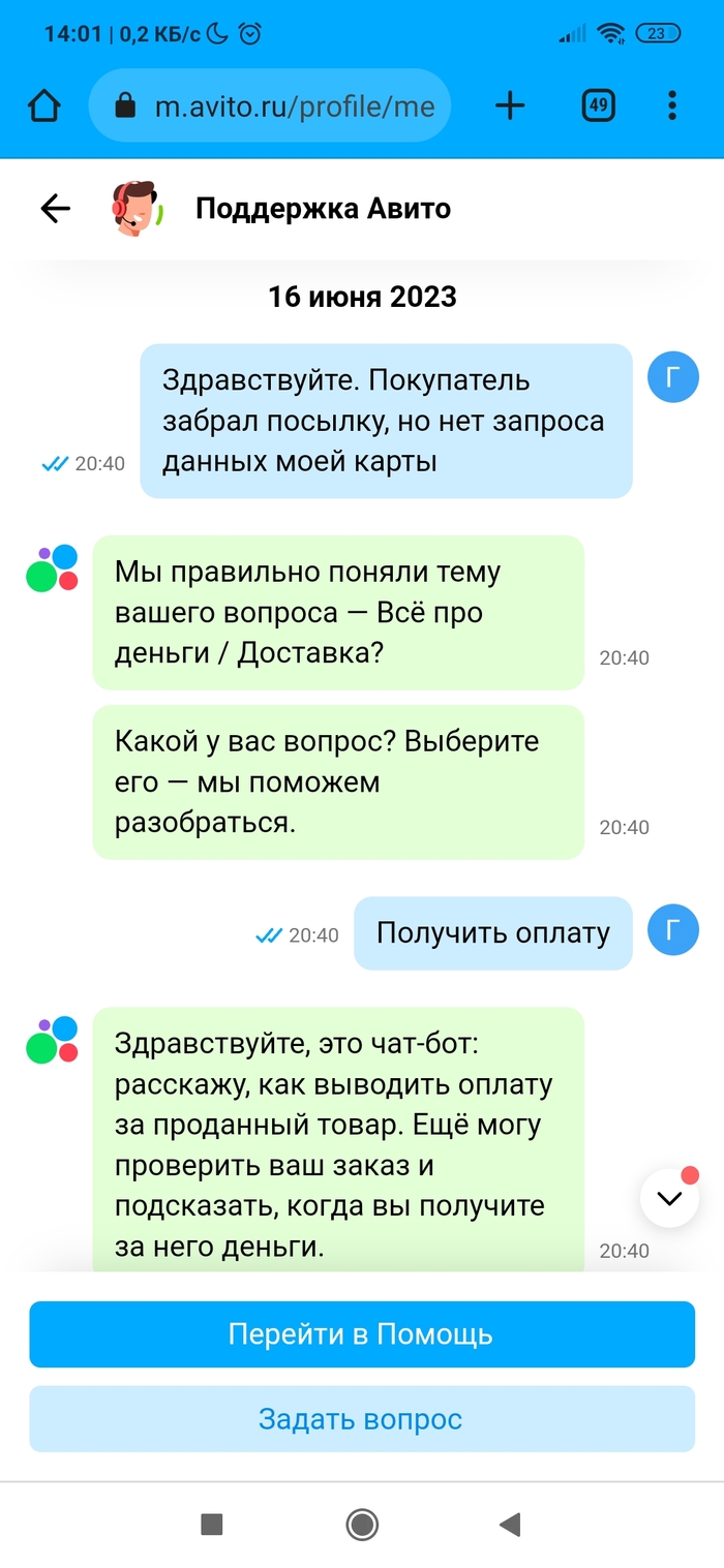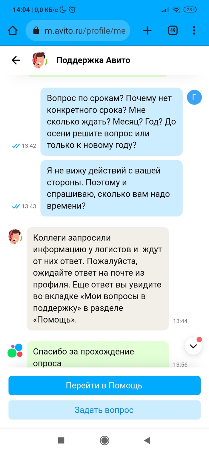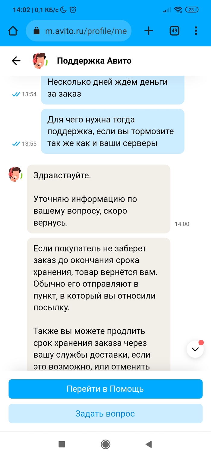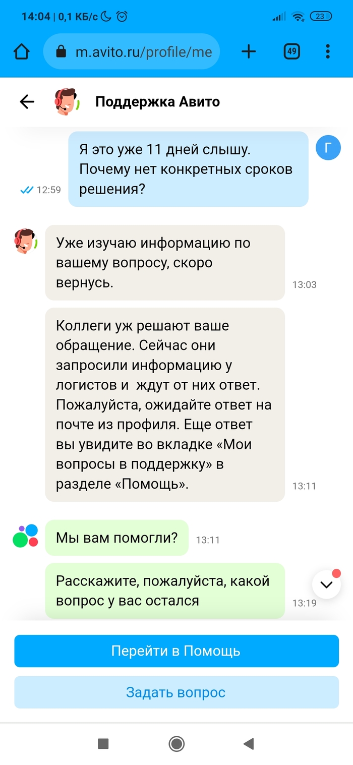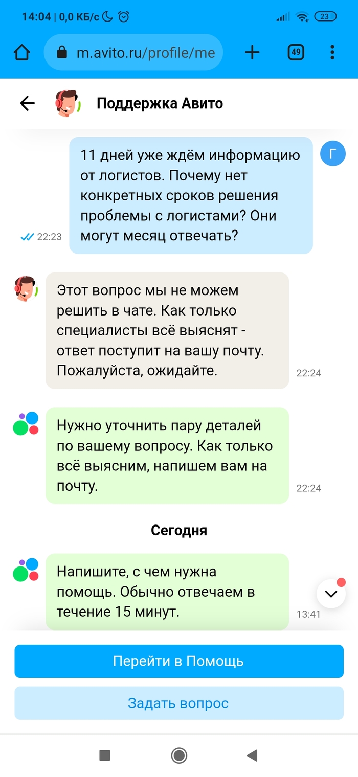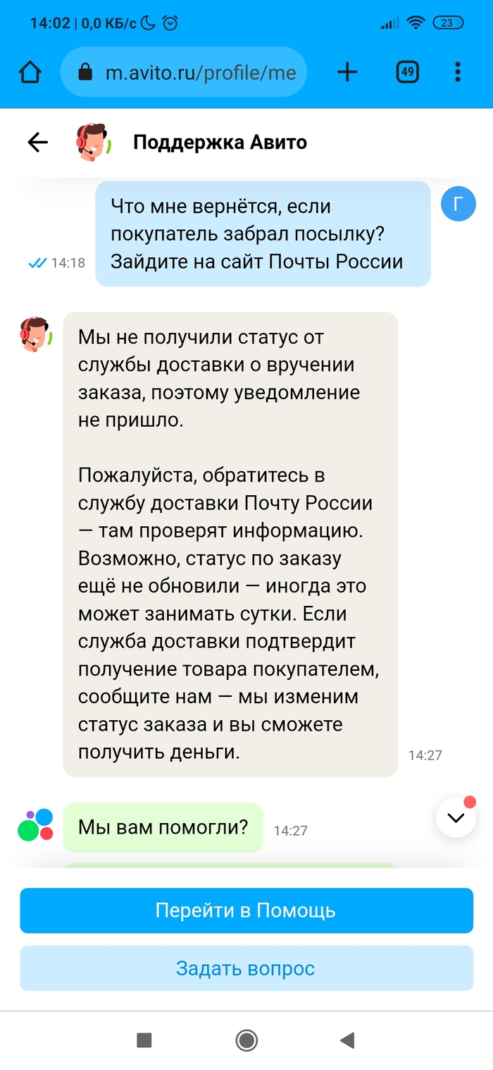 • Разместил вещь на Авито. Нашёлся покупатель. Отправил Авито доставкой (она сейчас какая-то новая, нужно самому оценить стоимость доставки и указать её покупателю, в общем, всё сделать самому). Ну да бог с ней. Посылку отправили, но трек-номер не вводился на сервисе Авито. А без трек-номера сделка через несколько дней признается несостоявшейся по вине продавца. Причём на сайте Почты России было всё чётко. Долбежка в техподдержку не помогла, разве только что сроки указания трек-номера сдвигались. По итогу трек-номер смогли ввести только после доставки посылки в пункт выдачи. А это около недели прошло. Уже звоночек. А дальше началось. Посылку покупатель (очень порядочный человек оказался) забрал, по трек-номеру на сайте Почты России это тоже видно. Посылкой покупатель доволен. А вот Авито сново затупило. Пишет, что заказ в пункте выдачи ждёт. Покупатель уже сам написал Авито, что всё забрал. Но нет, логисты Авито не верят ни данным Почты России по трек-номеру ни покупателю. Абсурд ещё и в том, что просят ждать. Я жду с 16 июня, а сколько ждать - они уходят от ответа. Авито доставка уже не та, или работнички такие попались...