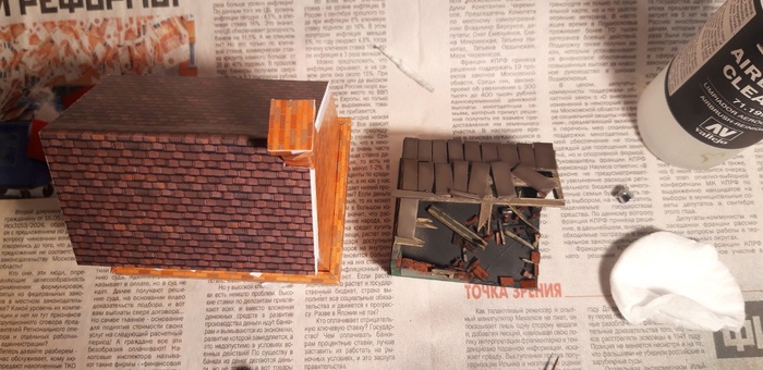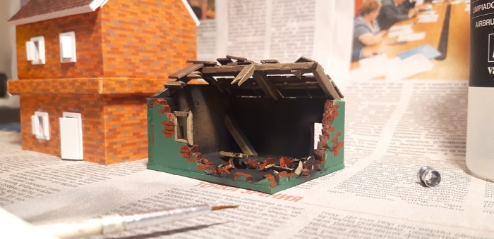 Жаба запрещает выкидывать даже мелкие огрызки, так что решил с пользой их использовать. Так как я все ещё не определился целостностью строений и материала было мало, то решил запилить небольшой частично разрушенный гараж/сарай и на этот раз засечь время на покраску.