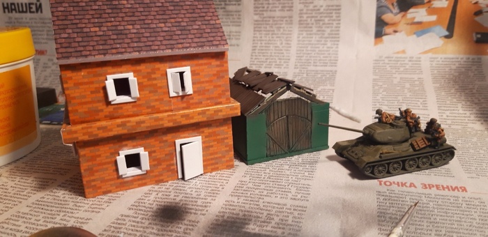 На безрыбье неплохо, домик симпатичный, но по материалам и времени на работу получилось не слишком вкусно. Текстуры съели бюджет, около 450р за дом вышло, но и круто сэкономили время и всего считая нарезку и поклейку получилось около 8 часов, самое долгое, разумеется, это резать каждую деталь каждого дома. Вспомним, что у меня в среднем 2 часа в неделю, то есть выходит что один дом я буду делать месяц, а на деревню из 7 домов потрачу больше полугода. Вот это уже плохо, думай голова, думай! Пока думал, из огрызков слепил и попробовал покрасить руины гаража, с целью определить время на проект