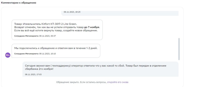 Испытал и мне попался бракованный измельчитель, создал обращение 31 Октября где мне указали что я должен вернуть его в офис сбера до 7го ноября. Вернул 2го ноября, статус не изменился в обращение, 7го числа автоматически закрылось обращение, при этом я писал и звонил им что товар вернул.