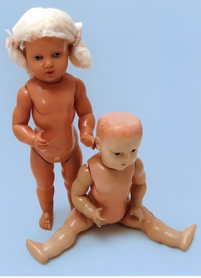 Появляются новые типажи: пупс Вовка с закрытыми глазами — натуралистичный младенец со старомодной серьезностью на лице, непривычной для современных глазу. Чуть позже в кукольный мир пробираются улыбка, ясный взгляд, и даже мальчик-негр, дань идеологии интернационализма. Причём цвет кожи куклы менялся в зависимости от партии целлулоида; некоторые светлые «негритята» сощуренными (от радости, а не от этнической принадлежности) глазами воспринимались покупателями то ли таджиками, то ли кем-то ещё. Здесь искусство неожиданно становится зеркалом: каждая кукла — отклик на политический символ, технологический вызов, психологический портрет времени.