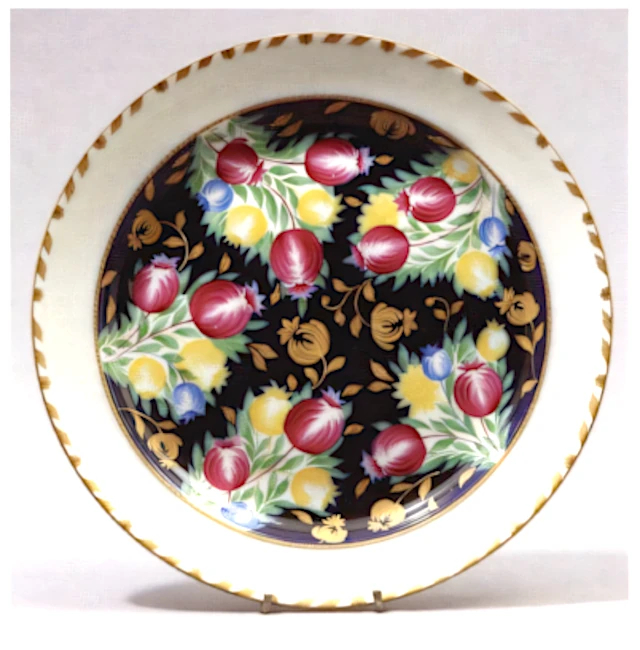 Мастер не злоупотреблял старинным стилем, а представил работу в духе своего времени с традиционным для классицизма орнаментом по борту. Вероятно, древнего металла было недостаточно, что и объясняет оригинальную композицию. Он прикрепил тарелку к нехарактерному для своего времени ажурному подносу, придавая ей особую изящность при помощи чеканных узоров. Эта работа выглядит очень нарядно и привлекательно.