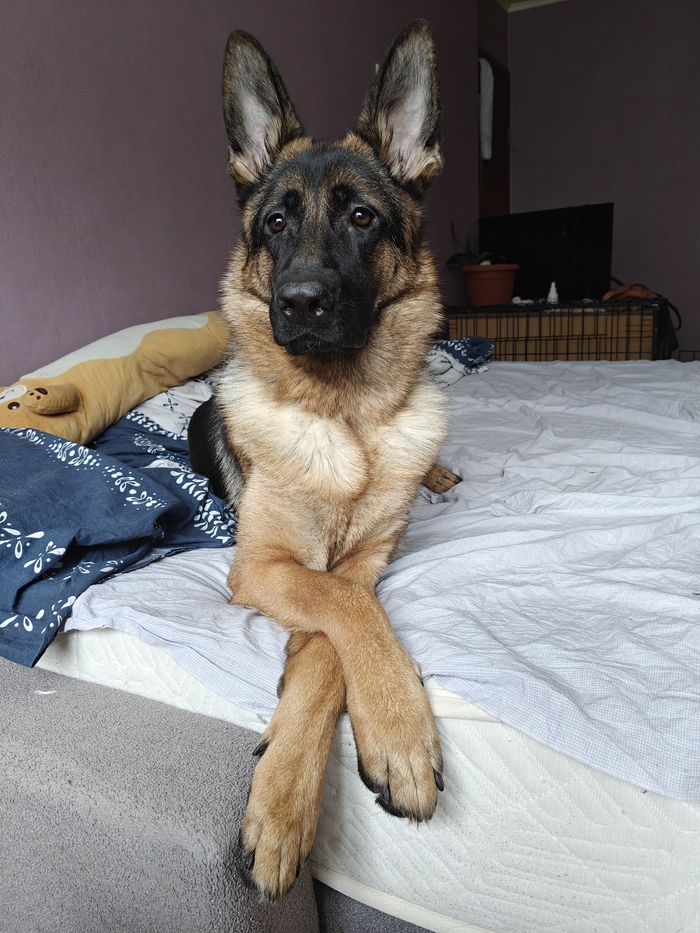 Немецкая овчарка это моя детская мечта. И только в 28 лет получилось ее осуществить. Как сейчас помню, 11 июля находим объявление, что продается щенок немца со всеми документами. Сильная аллергия. Быстро списываемся и едем, уже под вечер. Щенку 3.5 месяца, тощая, одни уши торчат, нам ее впихивают, как мешок. Благо, у девки все хорошо оказалось по здоровью. Необдуманно? Возможно. Но кто знает, что бы ждало ее в дальнейшем. Связываемся с заводчиком, рассказываем, что хозяева у щенка теперь другие, получаем необходимую информацию. Все. Наша. По документам она Венециана Вогер Торики Хаус. Прошлые хозяева назвали ее Альмой. Но дома она стала Хайке. Овчарка немецкая, имя тоже немецкое)
