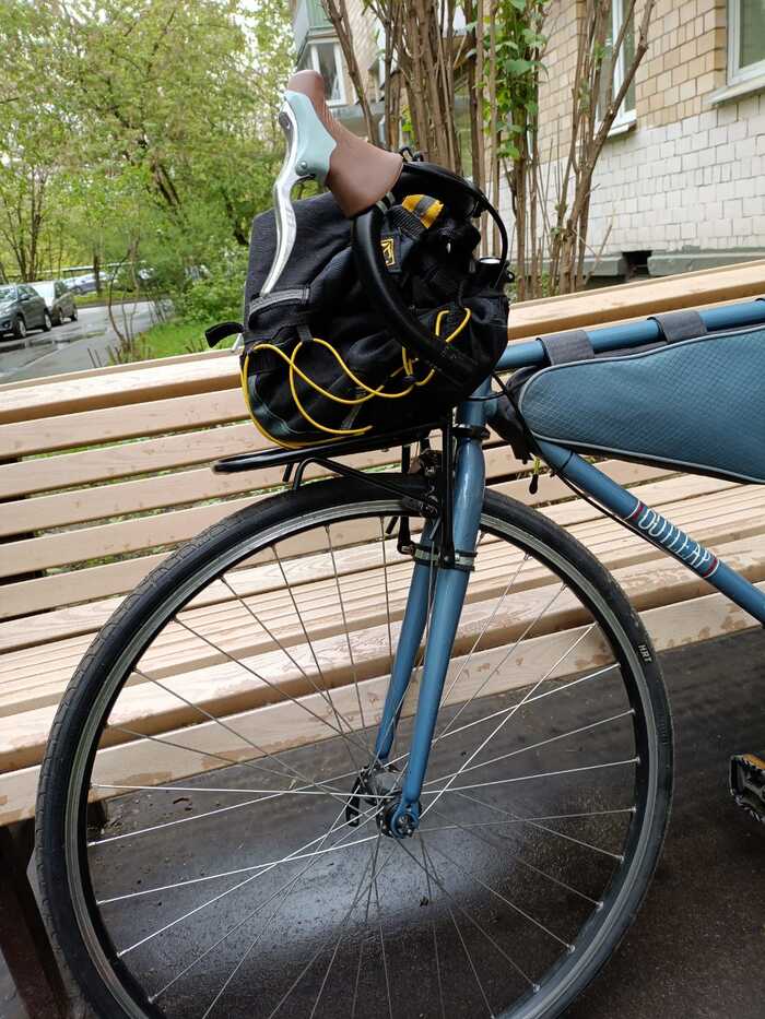 Так же был установлен передний багажник для того что бы таскать сменную одежду и ноутбук.