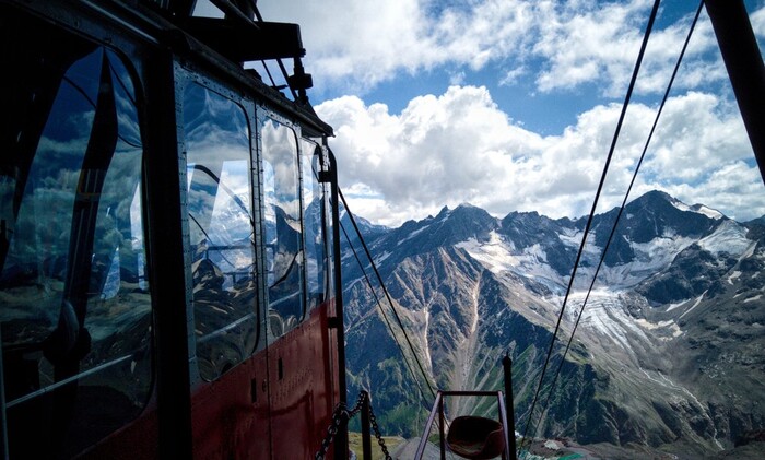 Но главное преимущество этой канатки — открытые кресла: на первом подъёме они двойные, а на втором вы едете один. Только ради этого чувства полёта стоит сюда приехать. Сидите, болтаете ногами над ущельем; мимо проплывают склоны ледников и зелёные цветущие луга; а справа, как подарок из обёртки, вам неспешно открывается Эльбрус.