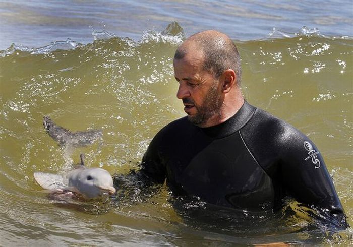 Дельфиненок уже еле попискивал, когда Брайану удалось вытащить его из смертельной ловушки...Подняв малыша над головой, инструктор показал его туристам.