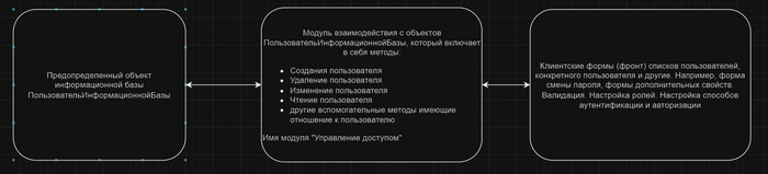 Т.е. при разворачивании ИБ (информационная база) разработчик может работать с метаданными в коде и реализовывать логику и интерфейс. Конкретно здесь нас интересует предопределенный тип МенеджерПользователейИнформационнойБазы. Его мы и будем использовать в данном разделе и все будет крутиться вокруг этого типа.
