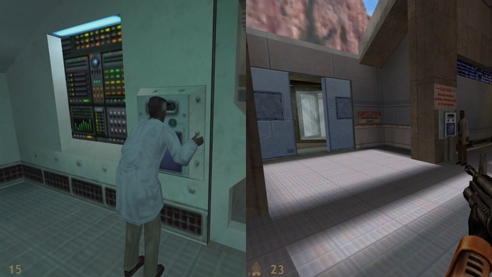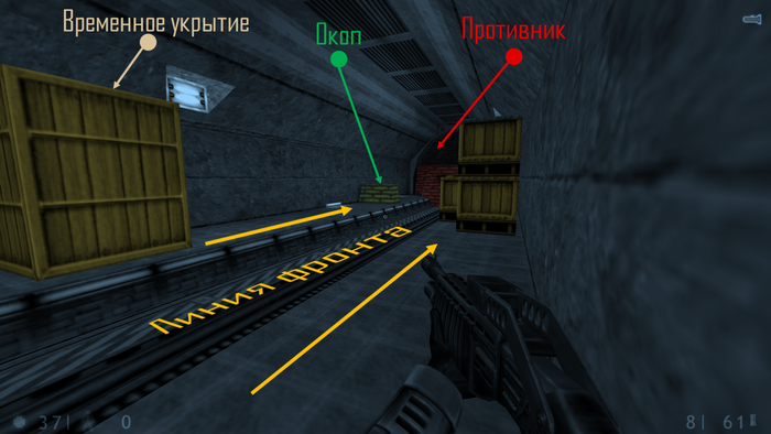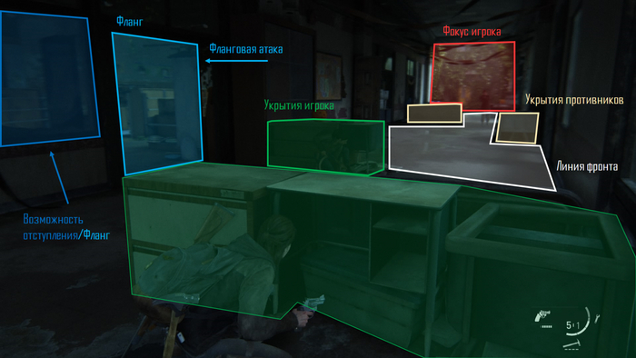На локации с обучением эффектам враги располагаются за укрытием с особым эффектом, чтобы стимулировать игрока выстрелить по нему и на практике узнать, какой именно эффект имеет данный блок. Это умный дизайнерский приём, который естественно вводит игрока в механику взаимодействия с окружением. Например, выстрелив по блоку с пружинным эффектом, игрок может увидеть, как враг отпрыгивает на определённое расстояние. Только на данной миссии противник упадёт в пропасть и умрёт, чтобы продемонстрировать, чего можно добиться подобным ходом. Такой подход позволяет игроку интуитивно изучать особенности окружения через игровой опыт.