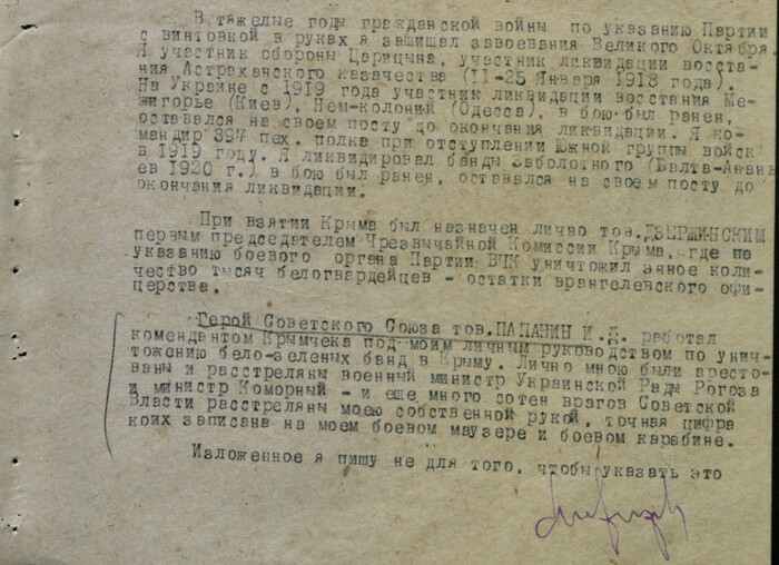 Герой Советского Союза тов. ПАПАНИН И. Д. работал комендантом КрымЧека под моим личным руководством по уничтожению бело-зеленых банд в Крыму. Лично мною были арестованы и расстреляны военный министр Украинской Рады Рогоза и министр Коморный — и еще много сотен врагов Советской Власти расстреляны моею собственной рукой, точная цифра коих записана на моем боевом маузере и боевом карабине…»