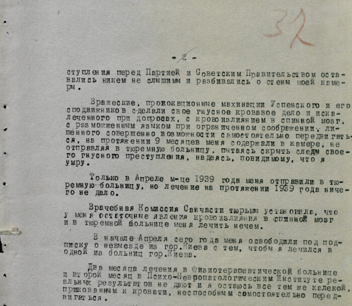 Двадцать два месяца в непрерывных муках своего томительного заключения в Киевской тюрьме, стены моей одиночки являлись свидетелями неслыханного ужаса творимого надо мной оперуполномоченными Успенского бывш. сотрудниками VI-го Отдела НКВД УССР (Грабарь, Коган, Ратнер), в результате гнусной провокации, зверскими смертельными избиениями и пытками переходившими границы садизма, свойственные только палачам фашистских тюрем капиталистических стран.