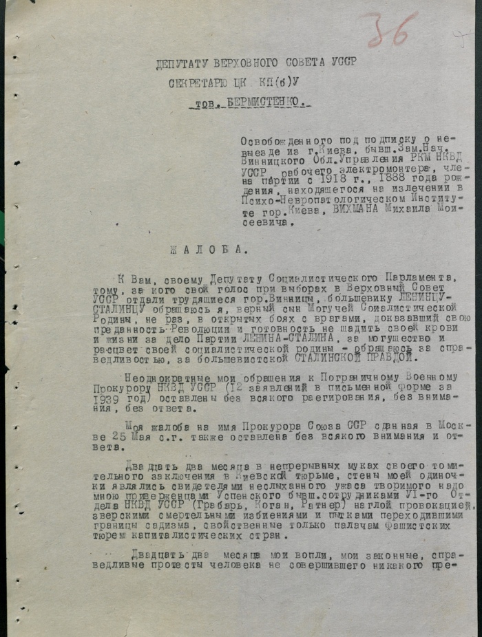«…К Вам, своему Депутату Социалистического Парламента, тому, за кого свой голос при выборах в Верховный Совет УССР отдали трудящиеся гор. Винницы, большевику ЛЕНИНЦУ- СТАЛИНЦУ, обращаюсь я, верный сын Могучей Социалистической Родины, не раз, в открытых боях с врагами, доказавший свою преданность Революции и готовность не щадить своей крови и жизни за дело Партии ЛЕНИНА–СТАЛИНА, за могущество и расцвет своей социалистической родины, – обращаюсь за справедливостью, за большевистской СТАЛИНСКОЙ ПРАВДОЙ.