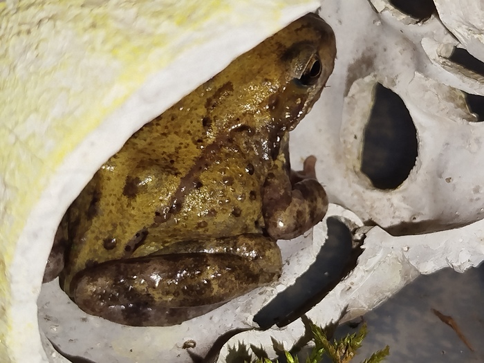 Короче, 3 января этого года, на обочине дороги возле замёрзшей канавы нашёл лягушку, как оказалось травяную. В Подмосковье, да. В ËБAHЫЙ МОРОЗ! Лягушка была вся окоченевшая, как льдышка. Решил взять домой, отогреть. В скором времени, амфибия задышала, а потом начала активно двигаться. Судя по пузу, она не особо то голодная. Но всё таки, решил её покормить. Под рукой у меня был живой мотыль, и сверчки, которыми я кормлю своих рыб