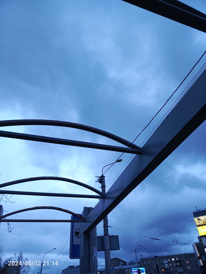 Фото с остановки "Березовая роща", крыши нет, металл ходит волнами от ветра.