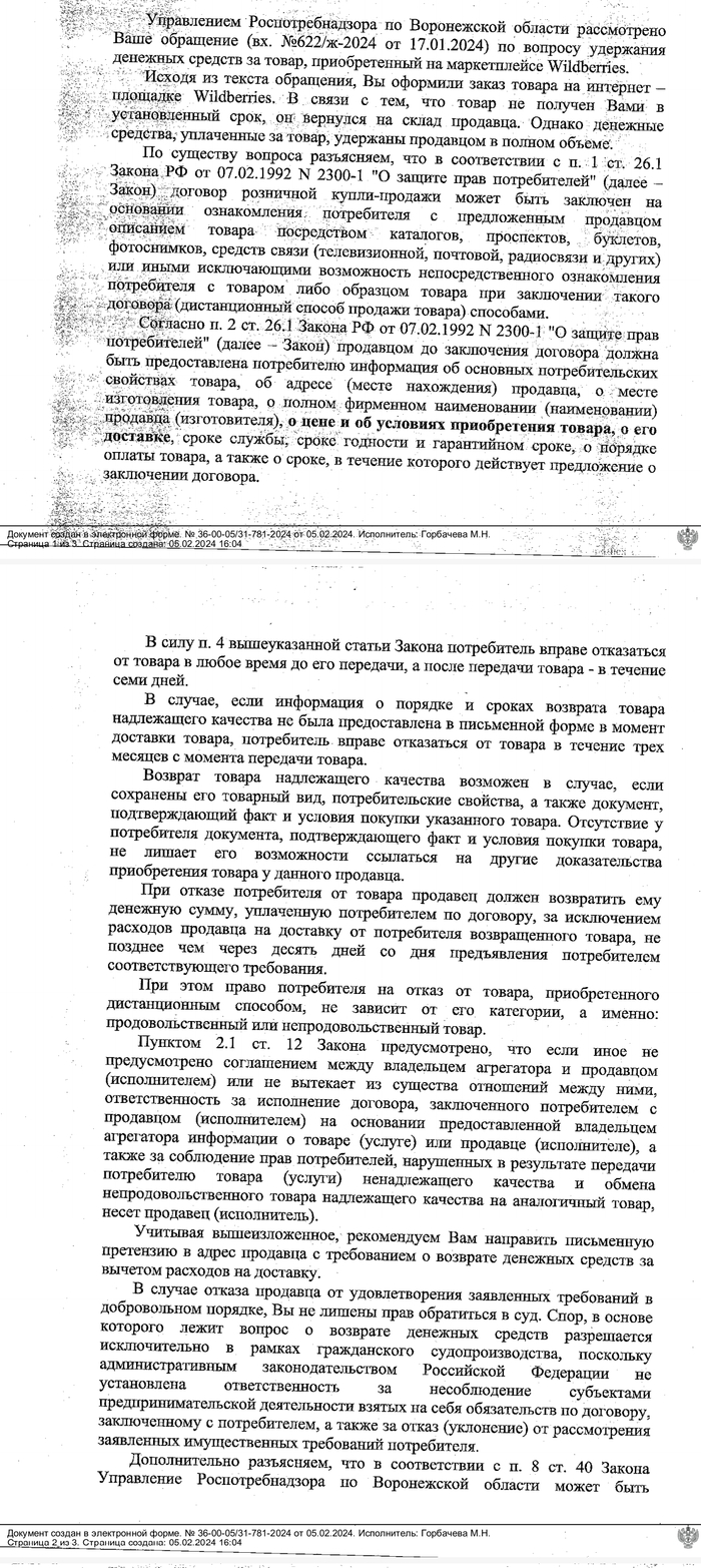 Я не буду заходить с аккаунта жены для того чтобы взять переписку с wb, покажи письмо-ответ от роспотребнадзора.