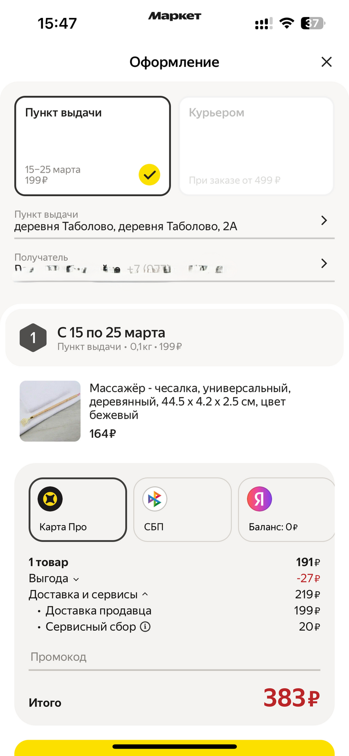 10 user9471397 Яндекс маркет вводит в заблуждение 9 месяцев назад Как же достал этот Яндекс. Пишут доставка бесплатно. Покупаю. Захожу в корзину, оформляю и вижу как сумма возрастает в два раза. Выясняется что они решили в ПВЗ за 199руб доставить. Показать полностью 3 [моё] Яндекс Маркет Обман Обман клиентов Защита прав потребителей Длиннопост Ещё 0