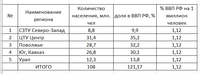 Обратите внимание на указанные доли численности населения каждого региона, где пройдёт ВСМ и доля этого региона в общем ВВП России на момент утверждения национального проекта. Вот эти данные, сведённые в таблицу
