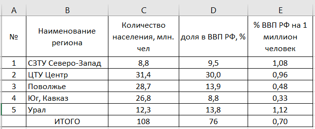 Столбец E показывает, сколько % ВВП России приходится на один миллион жителей региона. Фактически, это комплексный показатель производительности труда в регионе. Как видно, из пяти регионов получаются две группы, фактически В РАЗЫ отличающиеся друг от друга