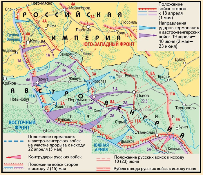 Однако в ходе Горлицкого прорыва начатого 19 апреля 1915 года осуществленное австро-немецкой армией, Галиция была практически вся потеряна, командующий проявил безынициативность и безволие потери составили до 500 тысяч человек и 350 орудий, но небольшую территории удалось удержать.