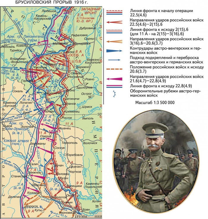 1.Алексей Алексеевич Брусилов, генерал-адъютант (19 (31) августа 1853, Тифлис — 17 марта 1926, Москва). С 17 марта 1916 года — главнокомандующий армиями Юго-Западного фронта.Верховный главнокомандующий Русской императорской армии (22 мая — 19 июля 1917), главный инспектор кавалерии Красной армии (1923).Командующий 8-армией в Галицийской битве.В июне 1916 года провёл успешное наступление Юго-Западного фронта - Луцкий прорыв названный позднее Брусиловским прорывом, применив при этом неизвестную ранее форму прорыва позиционного фронта, заключавшуюся в одновременном наступлении всех армий, эту тактику позднее применил маршал К.К.Рокоссовский при планировании операции "Багратион" в 1944 году во время Великой Отечественной Войны.