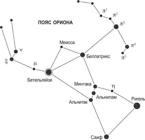 Особое внимание привлекает так называемый Пояс Ориона, состоящий из трёх расположенных по прямой линии, чуть наискосок справа налево звёзд, голубых сверхгигантов (Минтака (Пояс), Альнилам (Нить Жемчуга), Альнитак (Кушак)). Именно по этим трём звёздам созвездие Ориона легко отыскать на ночном небе. Эти звёзды расположены в косую линию, практически на одинаковом расстоянии друг от друга. Линия указывает своим юго-западным концом (со стороны Альнитак) на самую яркую звезду Северного неба – Сириус в созвездии Большой пёс (впечатление такое, что Большой пёс несёт Сириус во рту), а северо-восточным концом — на красный гигант Альдебара́н в созвездии Тельца).