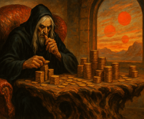 Не метафорически. Реально считал — стопку за стопкой, методично облизывая палец. Золотые септимы звенели о столешницу из окаменевшего мирового древа. За окном его башни тридцатого уровня Вертикального Города заходило третье солнце, окрашивая небо в цвет запёкшейся крови.