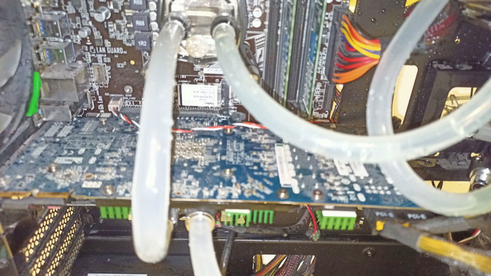 Первой отрубилась видеокарта - после пропажи изображения и появления шипящего звука с водоблока я сразу вырубил блок питания, надеясь спасти хотя бы материнскую плату. Но как, вы понимаете, этого поста бы не было, если бы все обошлось малой кровью.