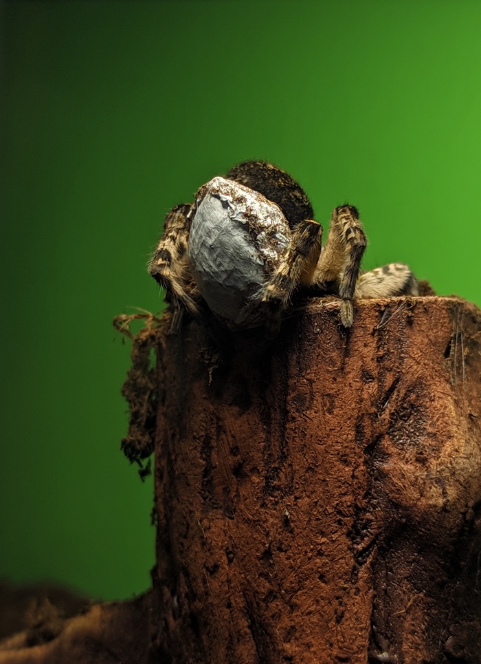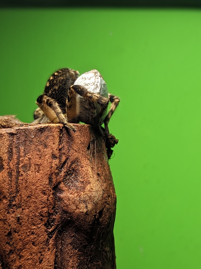 Собрал ей нехитрый террариум, нашёл в городе дилера тараканов для кормёжки, а на днях оказалось, что дама-то с прицепом. Сперва думал, что она закупорилась на зиму в норе, но оказалось, что откладывала яйца и теперь таскает кокон под свет лампы чтобы согреть