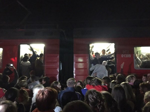 Двери тупо не закрывались, в итоге пришлось ждать следующие электрички и удалось запихнуться только в третью по счету (пустили доп электрички, периодичностью в 15-20 мин)