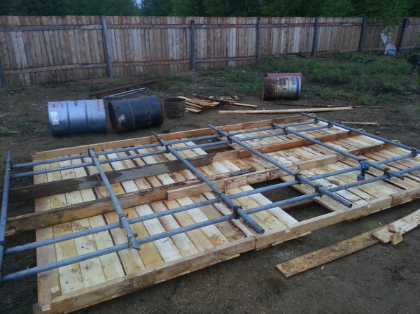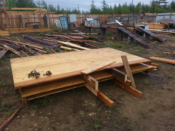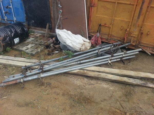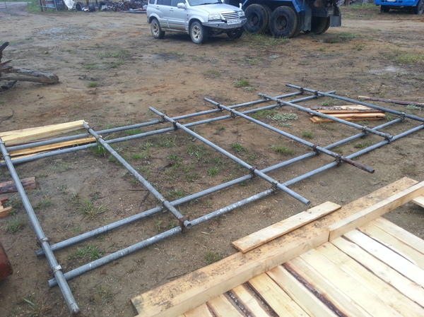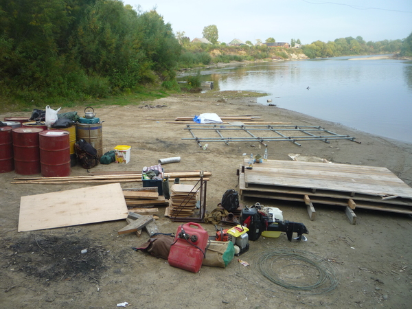 Вначале рассматривались варианты постройки каркаса из дерева, но проблема быстрой сборки и надежности в будущем, заставляли искать другие варианты. Хотелось сделать плот не на один год. Проблему решили корейские строительные леса (на дальнем востоке этого добра достаточно).