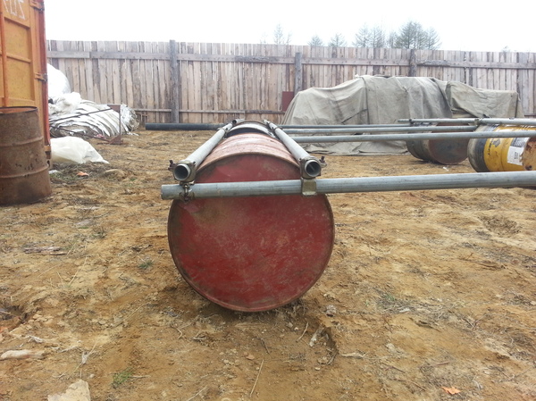 Каждая бочка сверху упирается в две трубы, соединенные между собой муфтами (муфты из того же наборе корейских труб). Цена трубы 120 рублей за метр. Нам понадобилось 35 метров таких труб. т.е. 4200р. Еще бочки с торцов зажимаются поперечными трубами, так что каждая тара жестко держится на своем месте за счет канта на торцах. Дополнительно бочки связываются с трубами проволокой.