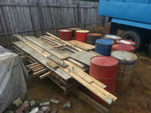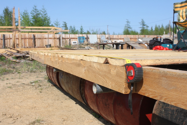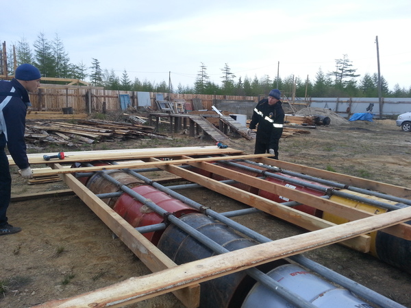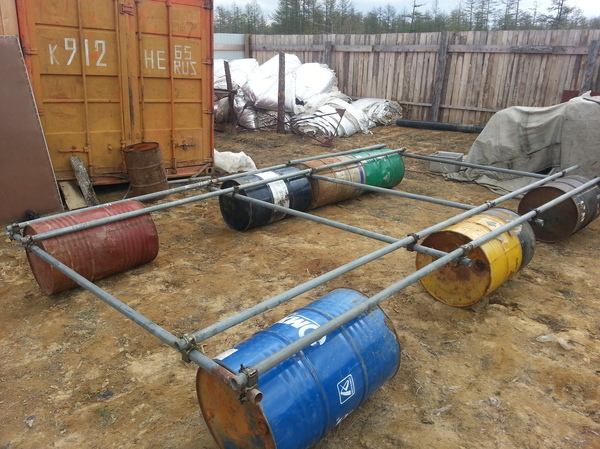 Весь вес плота и груза должен лечь на железные бочки. Изначально их планировалось от 6 до 8, но в виду конструкции решено было довести до 10 штук.