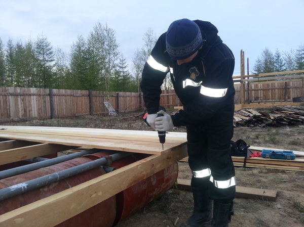 Собираем палубу. Главное правило - семь раз отметь, один отрежь. В данном случае это золотое правило. Доски имеют размеры 150х25 мм и 3 метра в длину. Их вес был подходящим, не в ущерб прочности каркаса. При ударе бочки о подводное препятствие энергия должна была пойти не в железным каркас, а в деревянный щит, который бы не дал сложиться трубам по диагонали. И слава богу что мы сделали всё крепко, подводный сюрприз во время плавания вмял бочку внутрь, так что мы чуть не попадали с плота, но бочка и каркас выдержали...