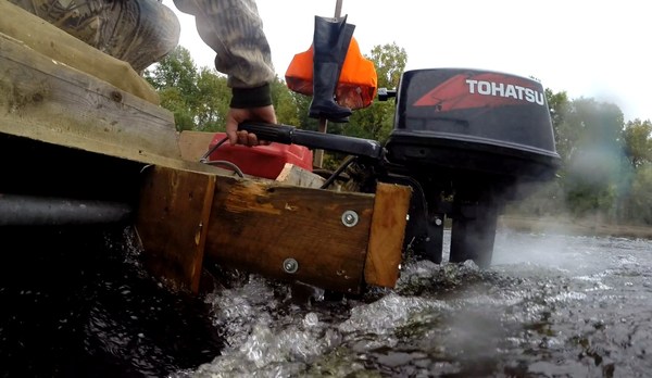 Так как у реки в верховьях было быстрое течение, а в низовьях его почти не было, на нашем плоту необходимо было установить мотор. Он позволял оперативно маневрировать на медленных и опасных случаях. Для его крепления был сделан транец. Две выходящие за габариты балки как раз и играли его роль. В итоге плавание превратилось в расслабончик)
