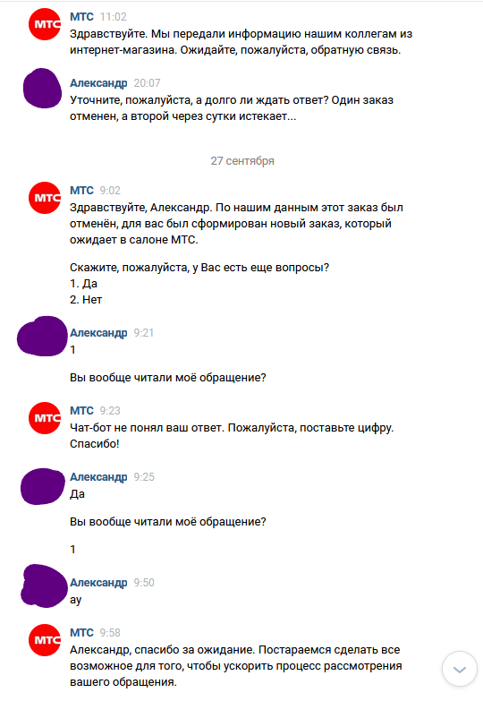 А дальше пошло веселье. Я накатал стену текста аккаунту МТС в ВК. Выкладываю всю переписку. Видно, что отвечает то бот, то человек.