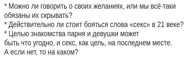 Секс? Казалось, что на сегодняшний день, цензура в общении недопустима. Свобода слова. Свобода мысли. А как на счет свободы желаний? - Наверное об этом не говорят. Слишком деликатно, да и ваши желания, высказанные публично, могут осуждаться — такое у нас с вами общество сегодня. Вам нужна анонимность для этого. Анонимность не от собеседника - от тех кто вас окружает, от общества.