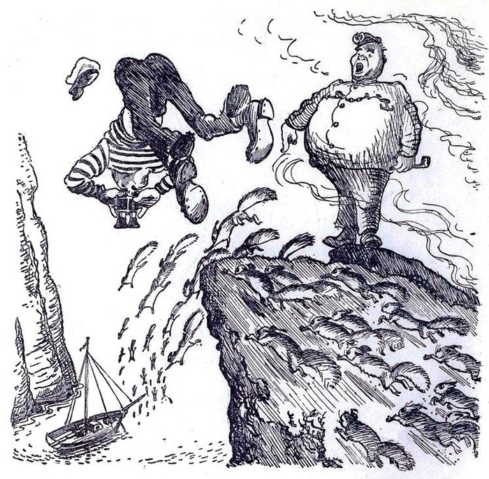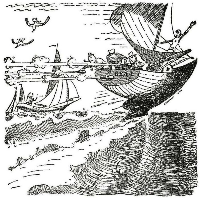 Сейчас такое детям писать нельзя. Старший помощник Лом, например, конкретно слаб по части спиртных напитков. Настолько, что, унюхав запах рома, сбивается с курса, и Врунгелю приходится двигать бутылку по столу, управляя ходом "Беды".