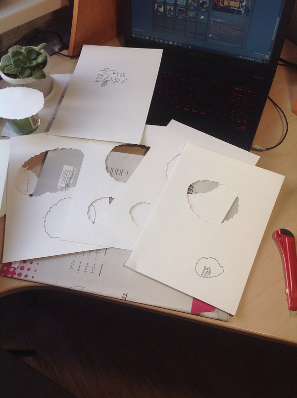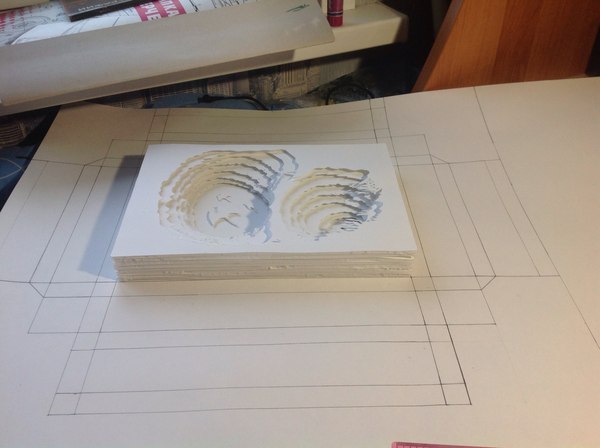 Шаг 1. Вырезаем слои. Лучше всего это делать специальным ножом и на досточке, но у меня под рукой был только канцелярский и папка из под А3)