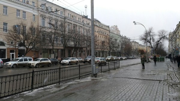 Вид на Большую Садовую с перекрестка. Слева на фотографии торец Консерватории. По правую руку здание Пединститута. Оттуда мы с вами пришли.