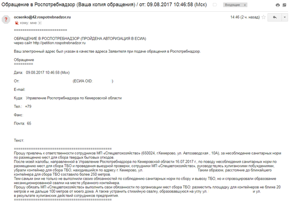 19 августа я получил письмо из кемеровского отделения Роспотребнадзора.