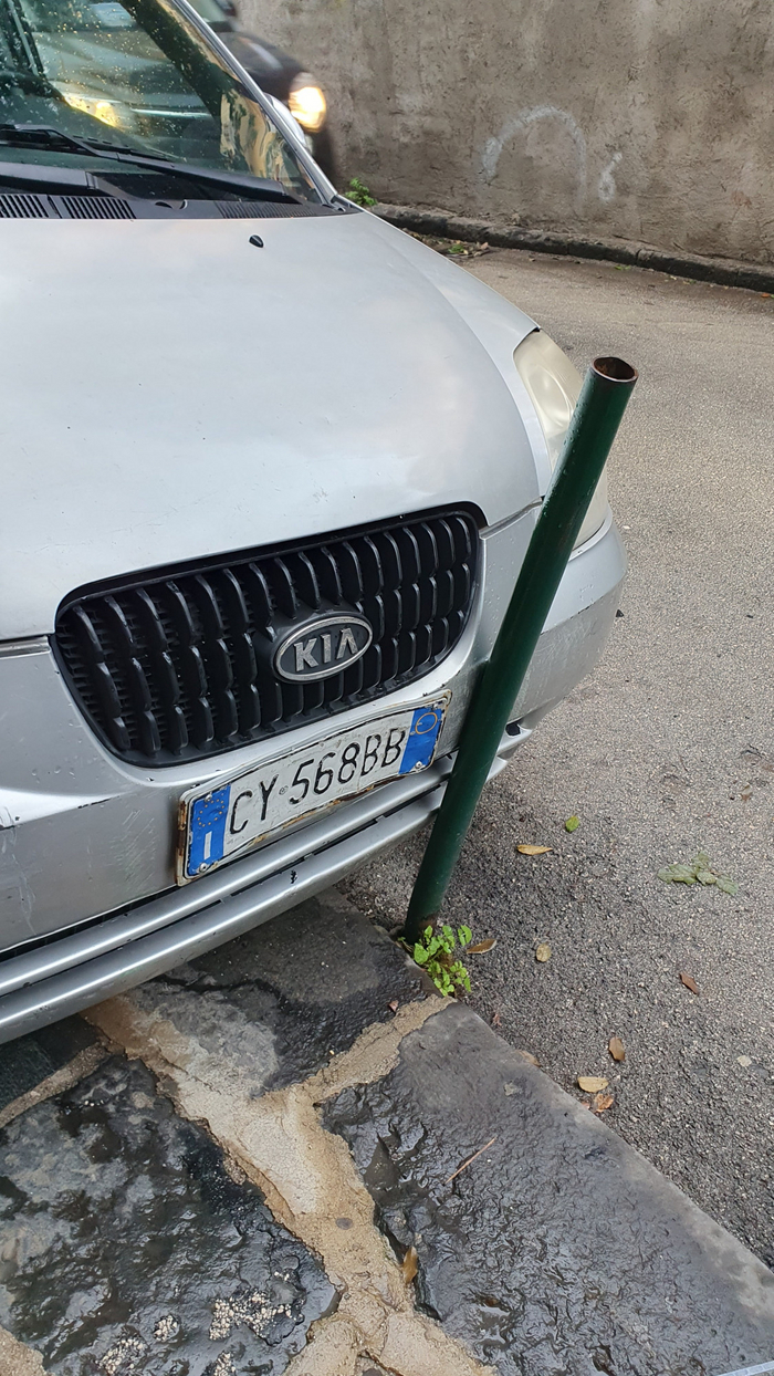Ну и, конечно, нужно сказать о их транспорте. Главные на дороге - это скутеры. Их тьма. Носятся они совершенно как бешеные. Причем ездят на них все: от молодежи до стариков. Поскольку двигатели двухтактные и их столь много воняет это все совершенно невыносимо. Дышать в городе нечем. Остальной автопарк на 80% состоит их маленьких фиатиков, рено, тойоток и прочей мелюзги. Все машины побиты. Нет ни одной с целым кузовом. Ни одной! При нас мужик выезжал из подворотни в узкой улочке, где мы жили. В качестве парктроника он использовал столбик, отгораживающий пешеходную часть: ткнулся в него бампером, сдал назад, выкручивая руль и выехал. Судя по тому, что столбик уже шатается, а на машине характерный след, он так каждый день делает. А вот так паркуются с помощью этих "парктроников".